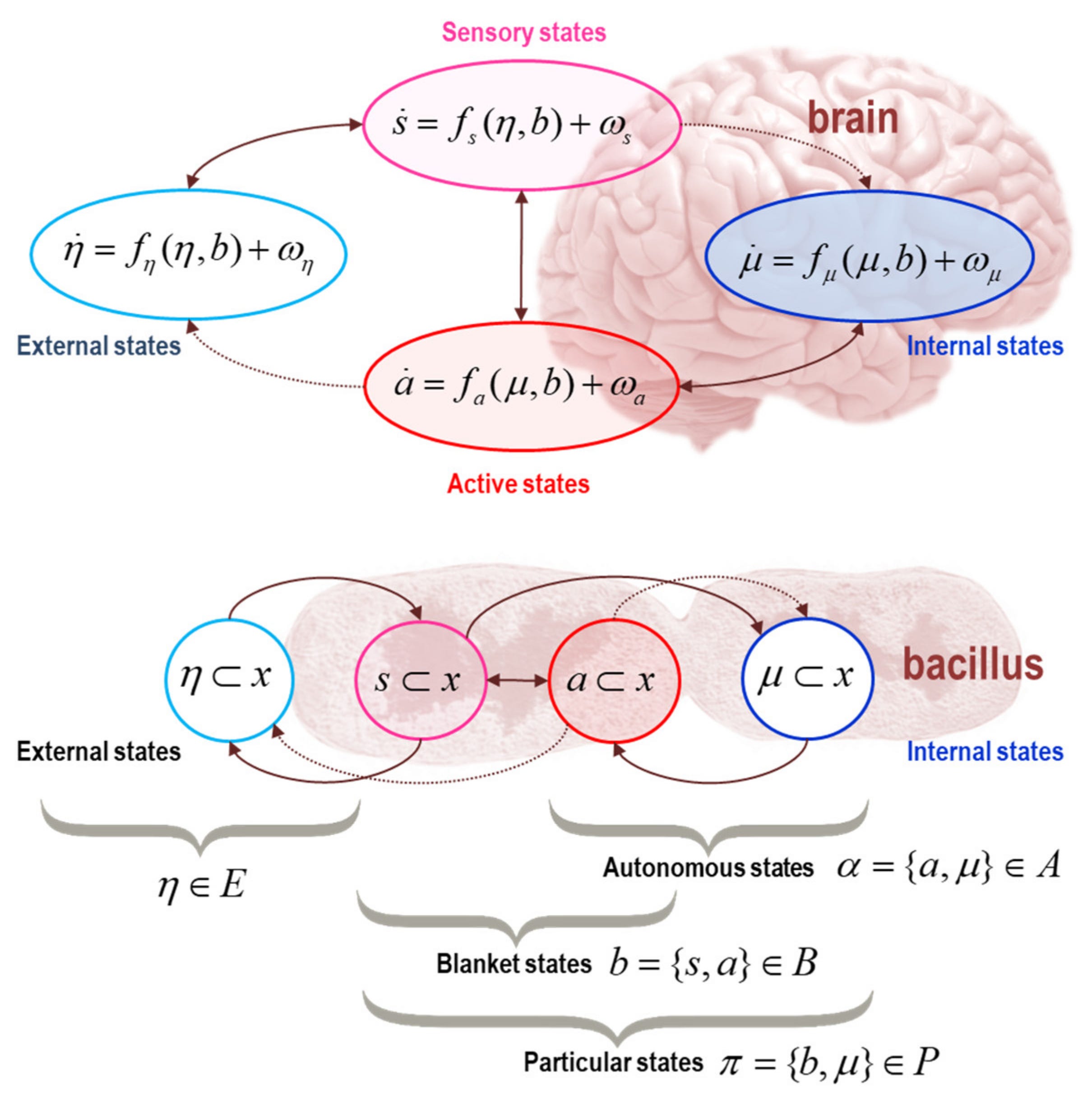And once you’ve got a partition of inside and outside, or internal and external states, you now have some system that is in open exchange with an environment, but only vicariously through boundary or blanket states. So that gives you a direction of travel both ways, where the inside influences the outside through active states, and the outside influences the inside through the sensory states.